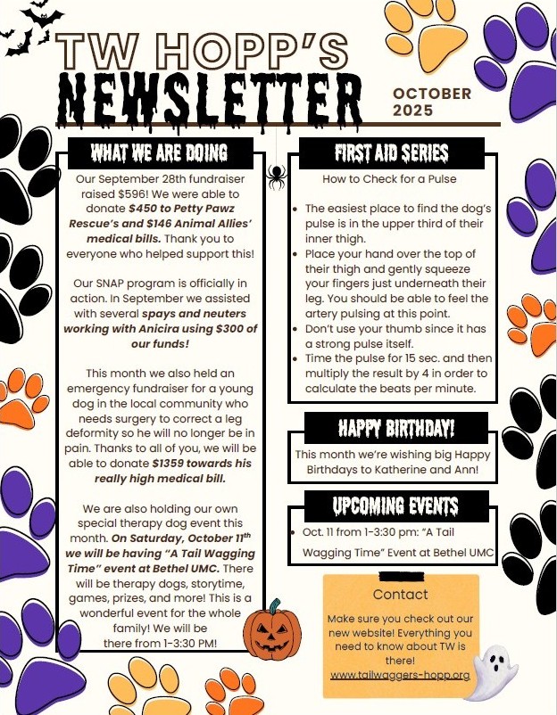 Catch up on what Tail Waggers HOPP, Inc. has been up to each month — from community drives to therapy dog visits and beyond.