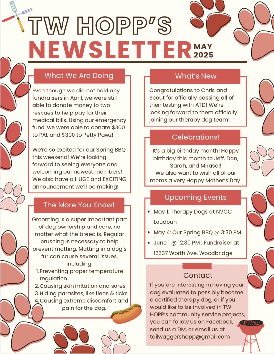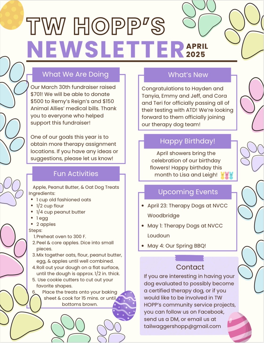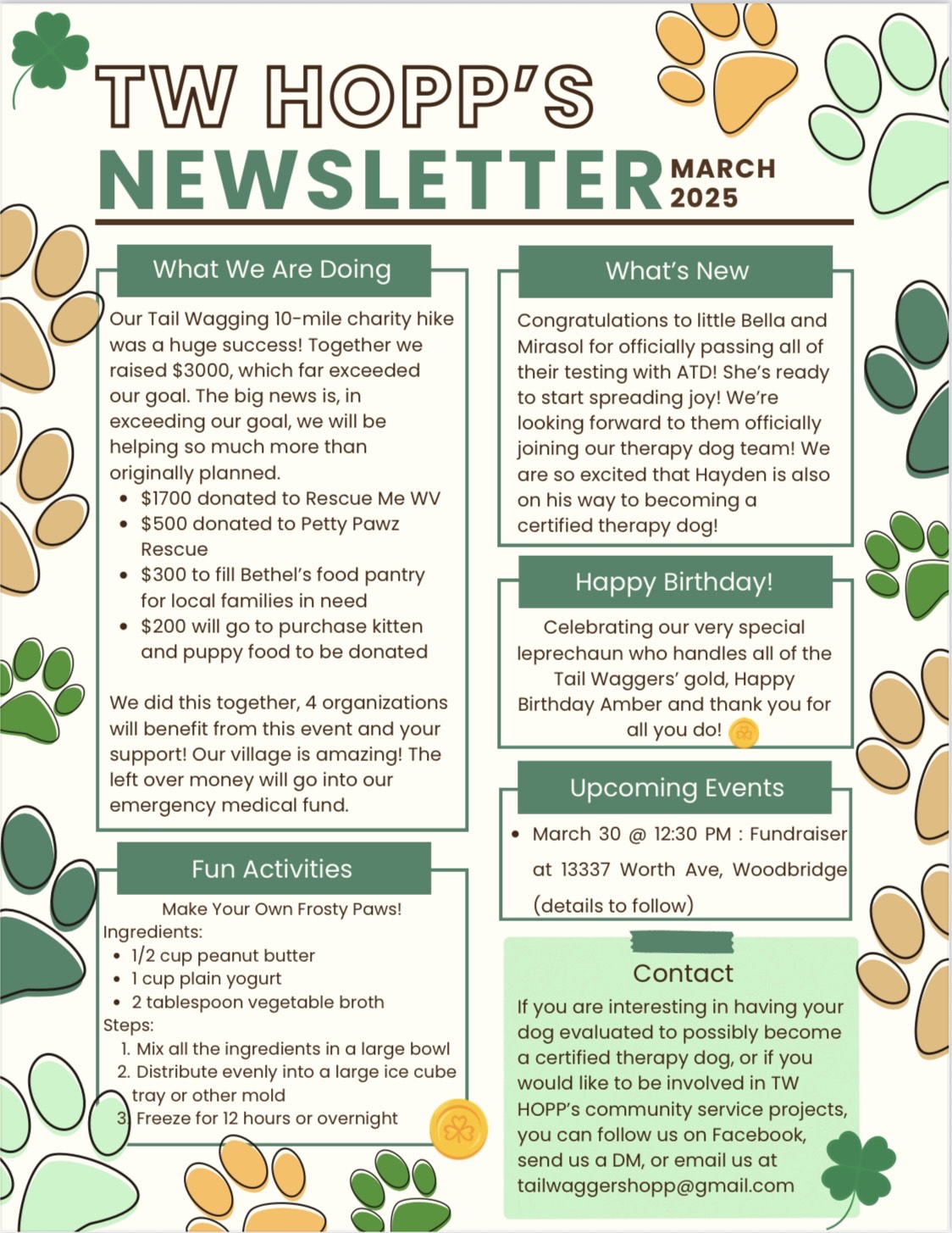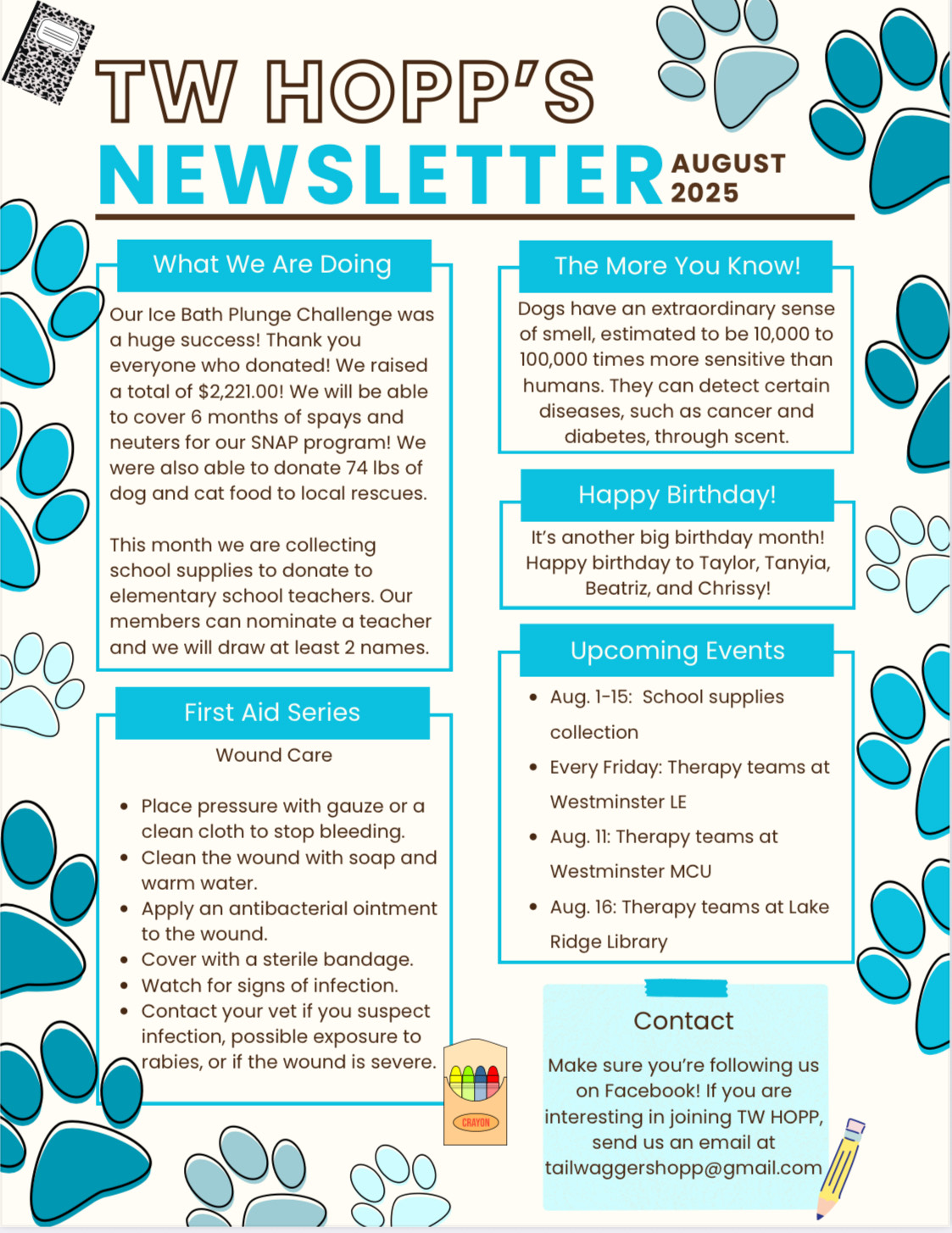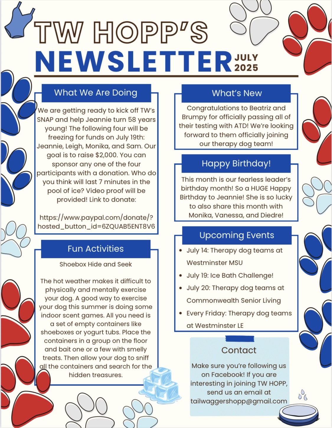 Catch up on what Tail Waggers HOPP, Inc. has been up to each month — from community drives to therapy dog visits and beyond.
